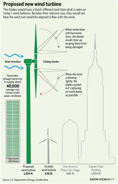 Who came up with this big idea? The Sandia superblades are based on concepts developed by Eric Loth, professor of mechanical and aerospace engineering at the University of Virginia. The design features a series of joints with the ability to fold in response to the strength of the wind. Positioned downwind of the tower (in contrast to conventional blades, which are upwind), the blades clinch like talons in extreme wind conditions, lessening forces on the turbine. Under ideal conditions, the blades would extend to their full length.