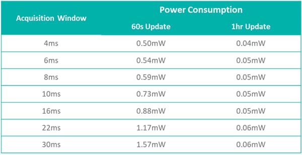 Table 2: Power consumption of the Maxim/BTI GPS Solution (Source: Maxim Integrated)