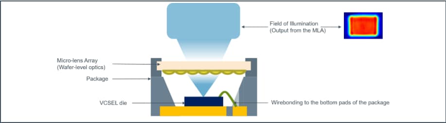 ams OSRAM EGA2000 Industrial High Power Flood Illuminators are composed of a VCSEL die and a micro-lens array (MLA). These are embedded in a package assembled with ams' state-of-the-art component manufacturing processes. The MLA enables an optimized field of illumination for different options of field of view of cameras depending on the applications: narrow, wide, and ultra-wide.